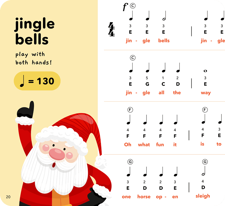 In Level 3, no more colours, we learn the concept of harmony, playing with both hands with finger numbers and learning how to play major and minor chords with melodies