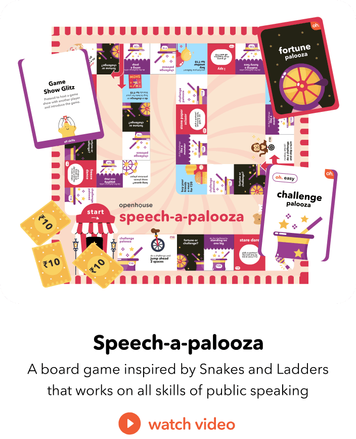 We use oh. Public Speaking Games™ — a proprietary game system built at Openhouse — to build skills such as storytelling, vocal variety and audience connection through repetition. Because it feels like play, children practise more, take more risks, and improve faster.