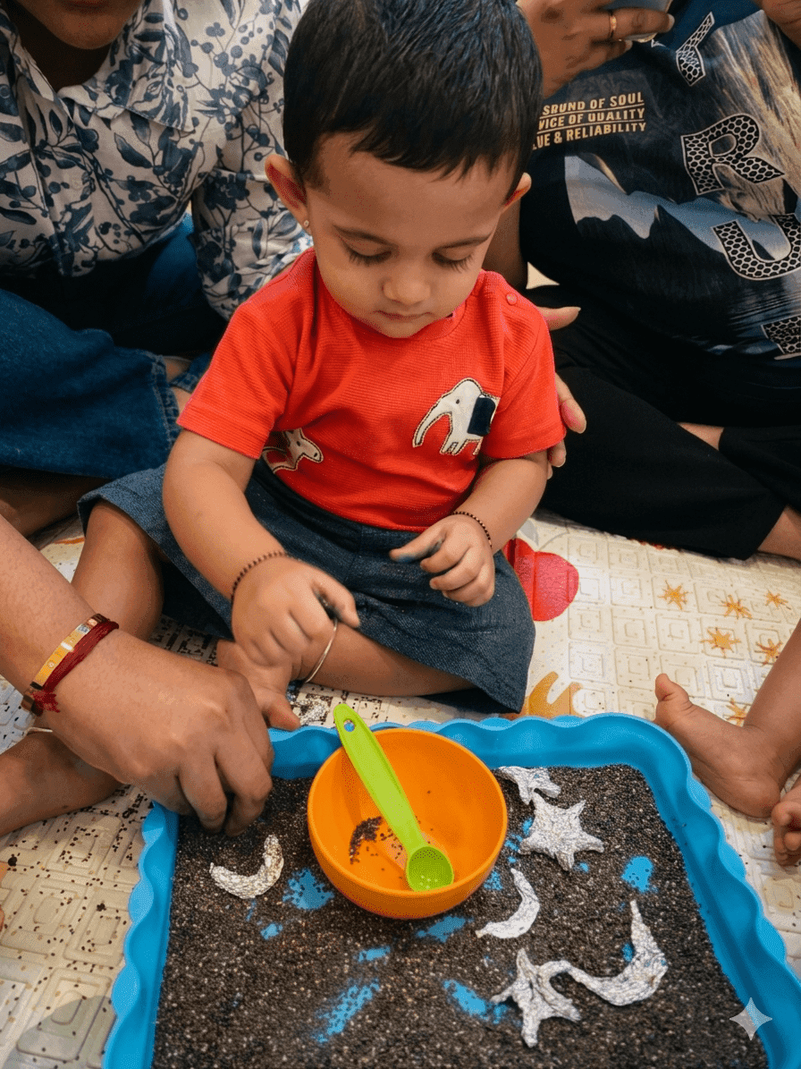 Children scoop and pour blue chia seeds and search for hidden foil stars, building curiosity and sensory exploration.