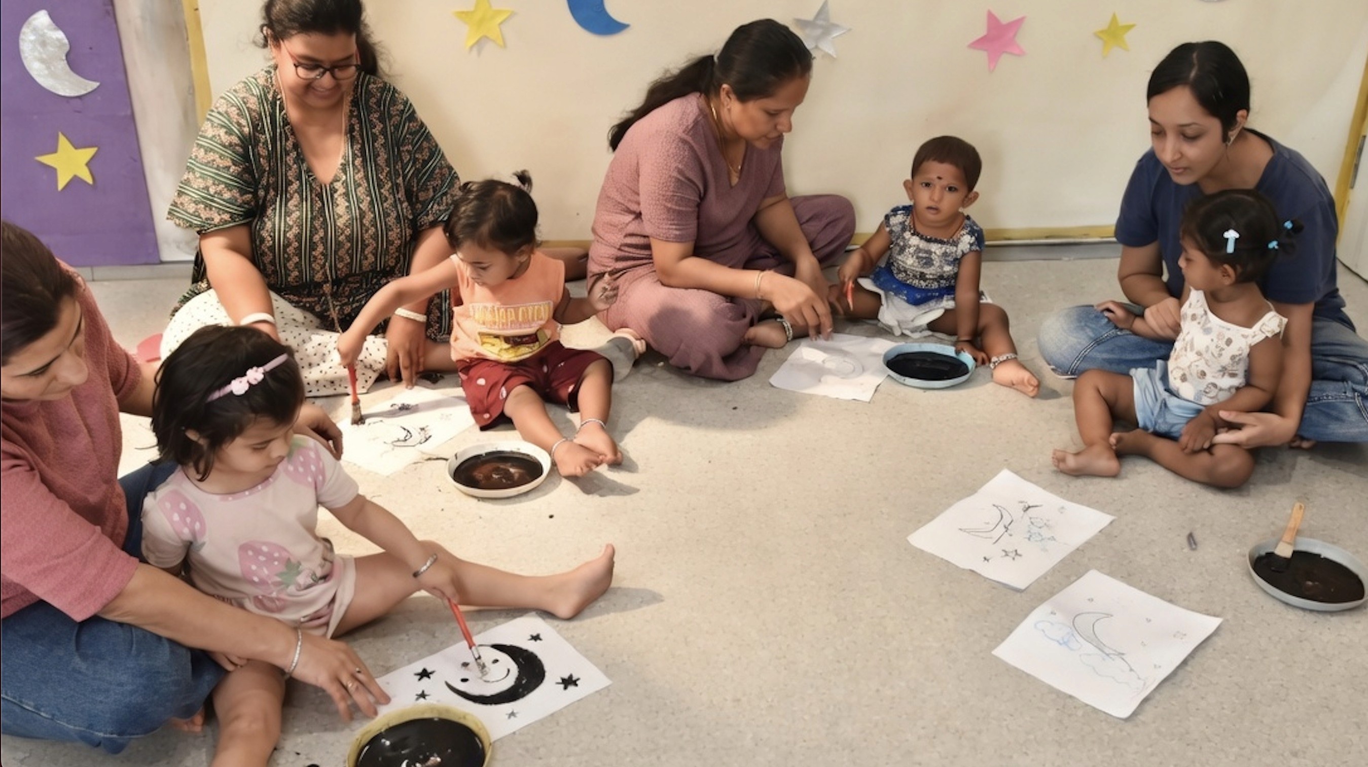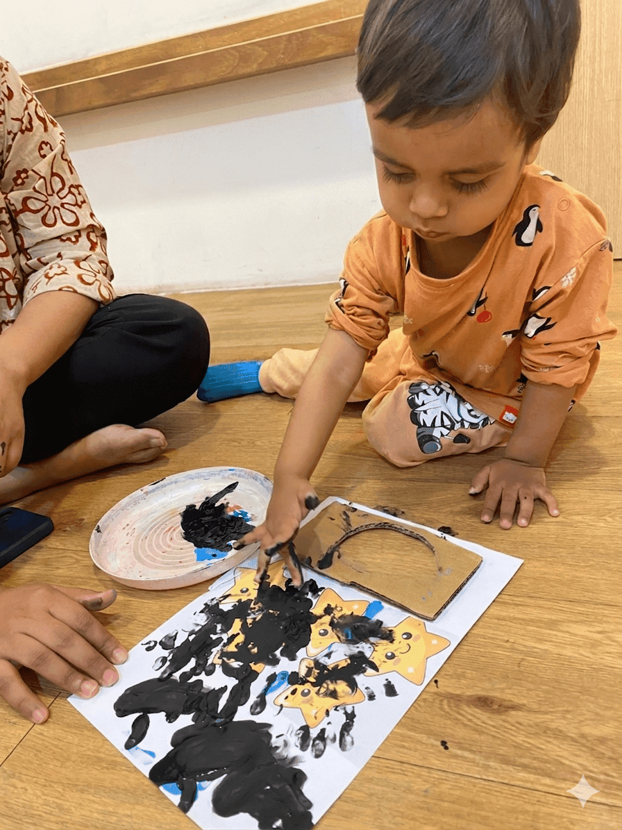 A calm, night-sky themed playdate where children explore stars, moons, and glow through sensory play, painting, collage, and simple art magic.