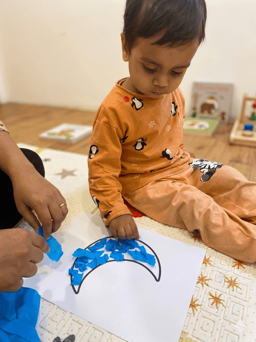 Children stick blue paper pieces inside a moon shape, creating a textured artwork while building fine motor skills.