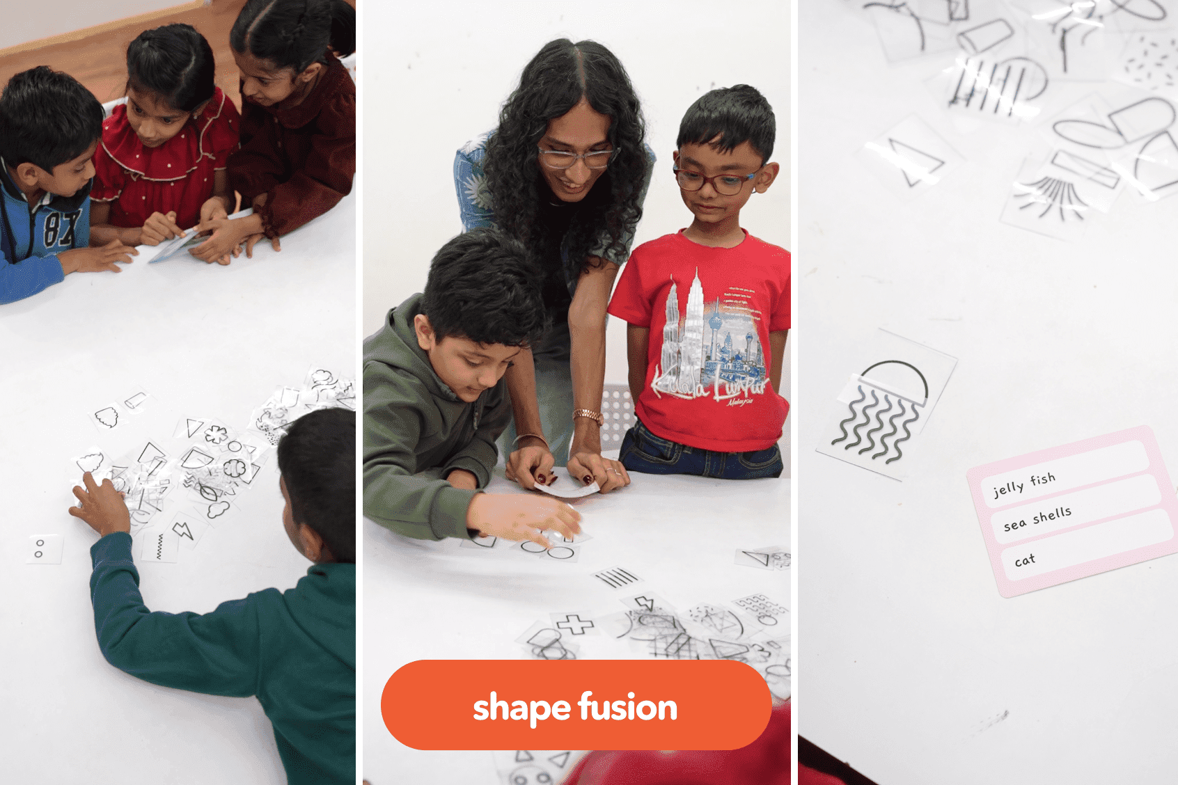 While their paintings dry, children play a guided shape-fusion game — combining simple shapes and ideas to spark imagination, visual thinking, and creative problem-solving.