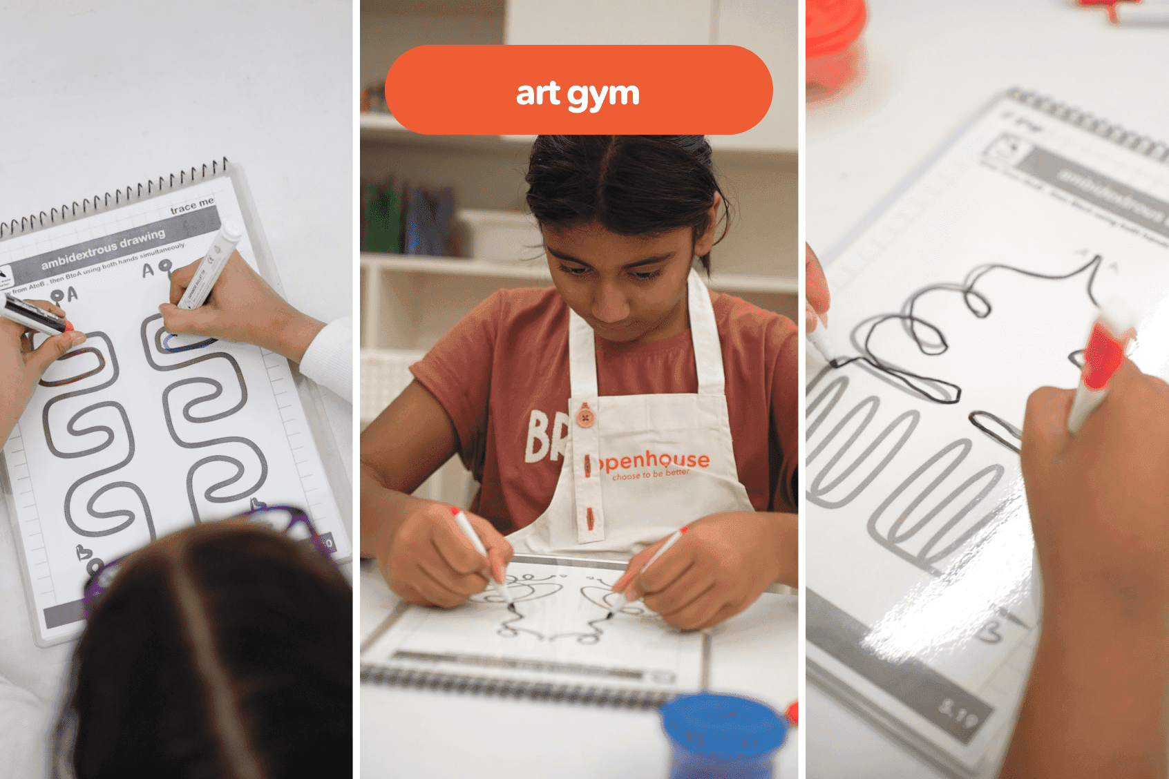 Children begin with a fun ambidextrous drawing warm-up, using both hands to draw simple shapes and lines — loosening fingers, wrists, and preparing their hands for painting.