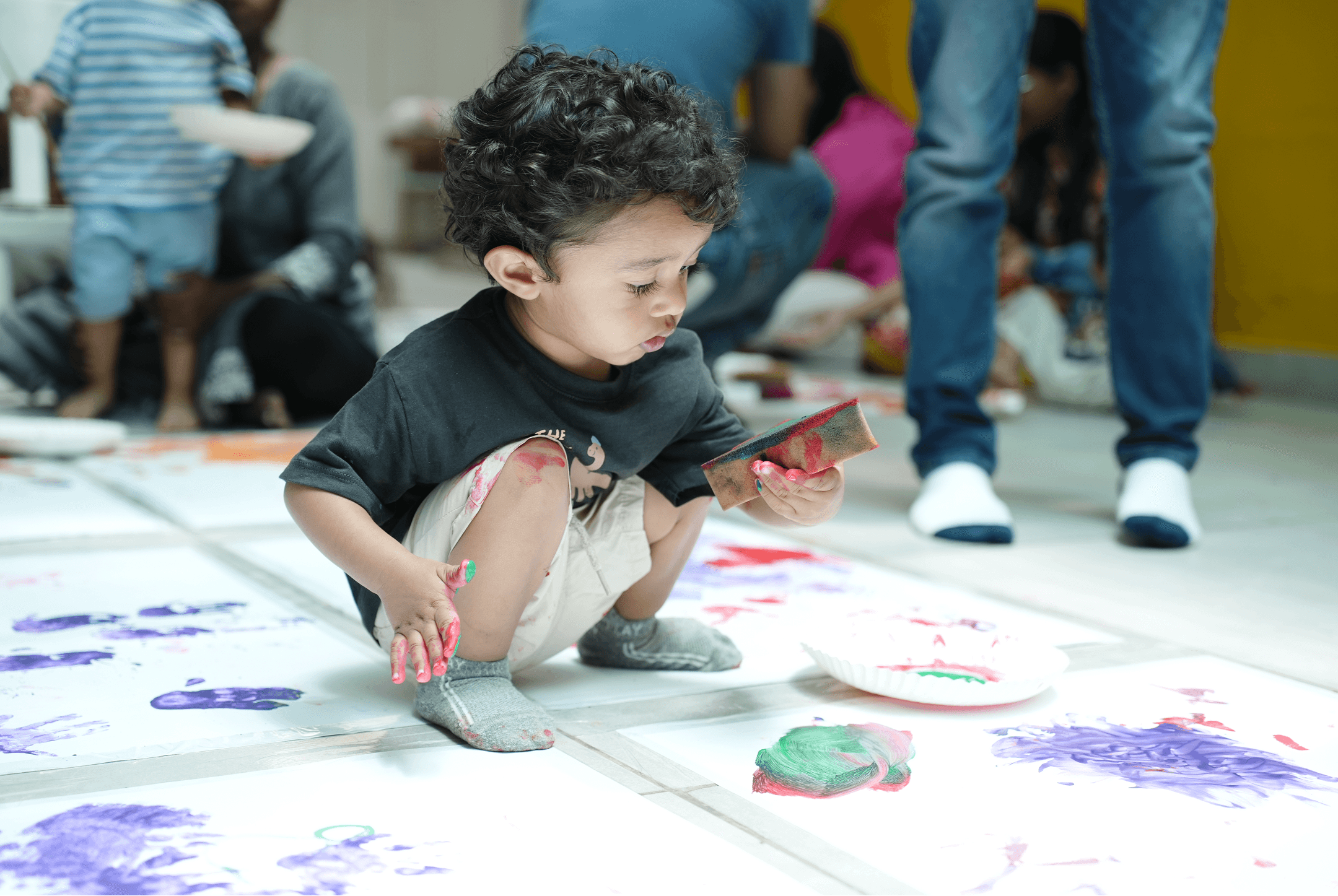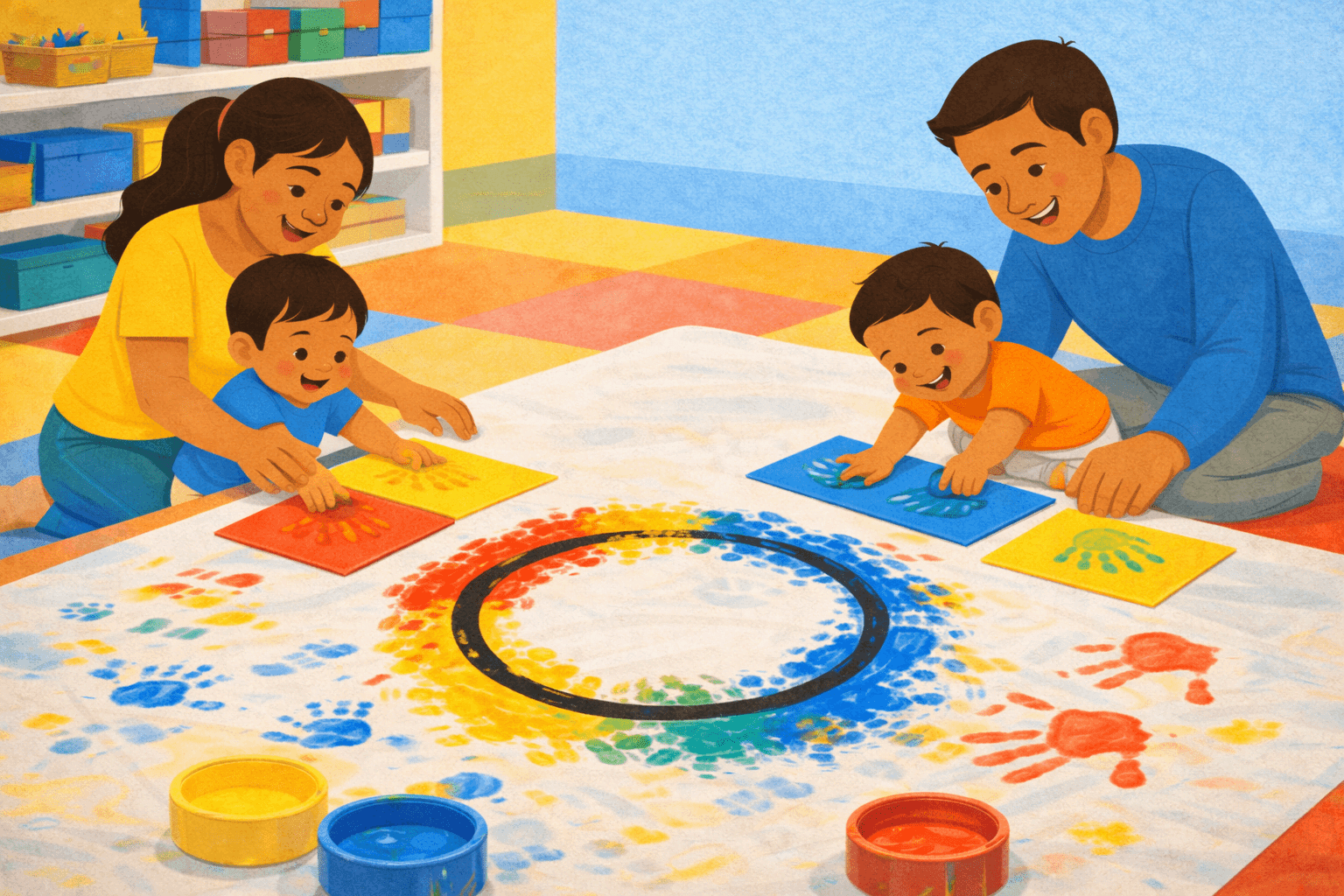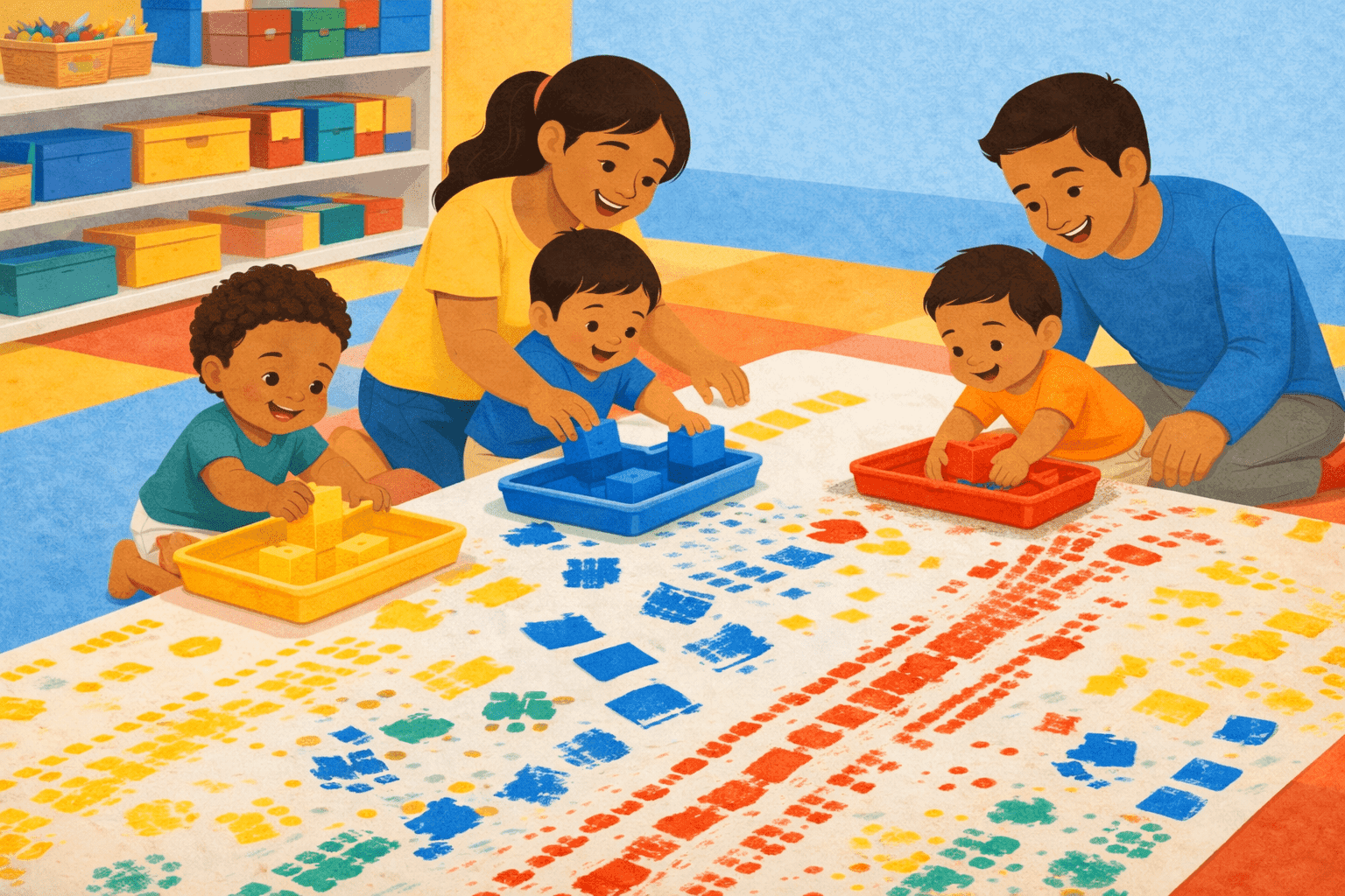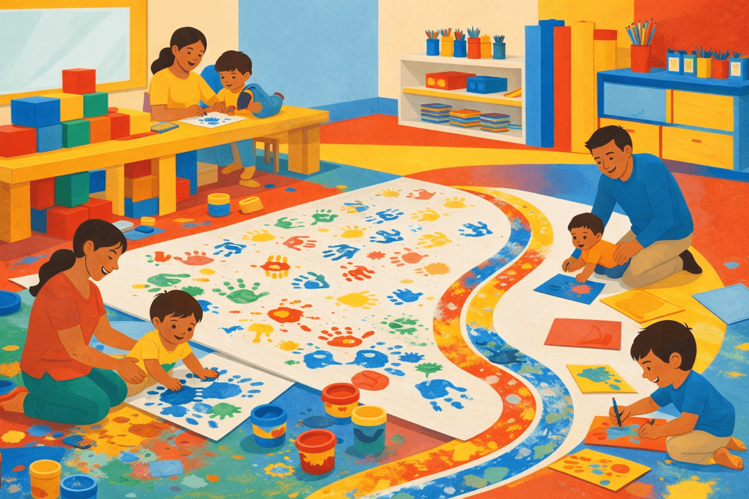 Walk into a giant red-yellow-blue art studio: a block-filled colour table, a huge printing mat, and messy handprint mixing magic. We’ll end with a fun “follow-the-ring” paint trail + crayon-on-colour paper challenge: bright, bold, and totally toddler