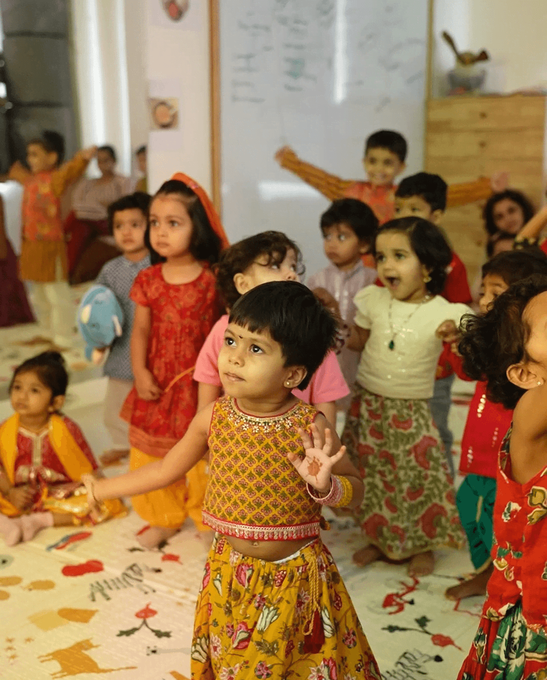 With parent support, children thread colourful harvest pieces to make a garland, then wear it for a joyful Lohri-inspired folk dance using scarves and wrist bells — exploring rhythm, music, and expressive movement.