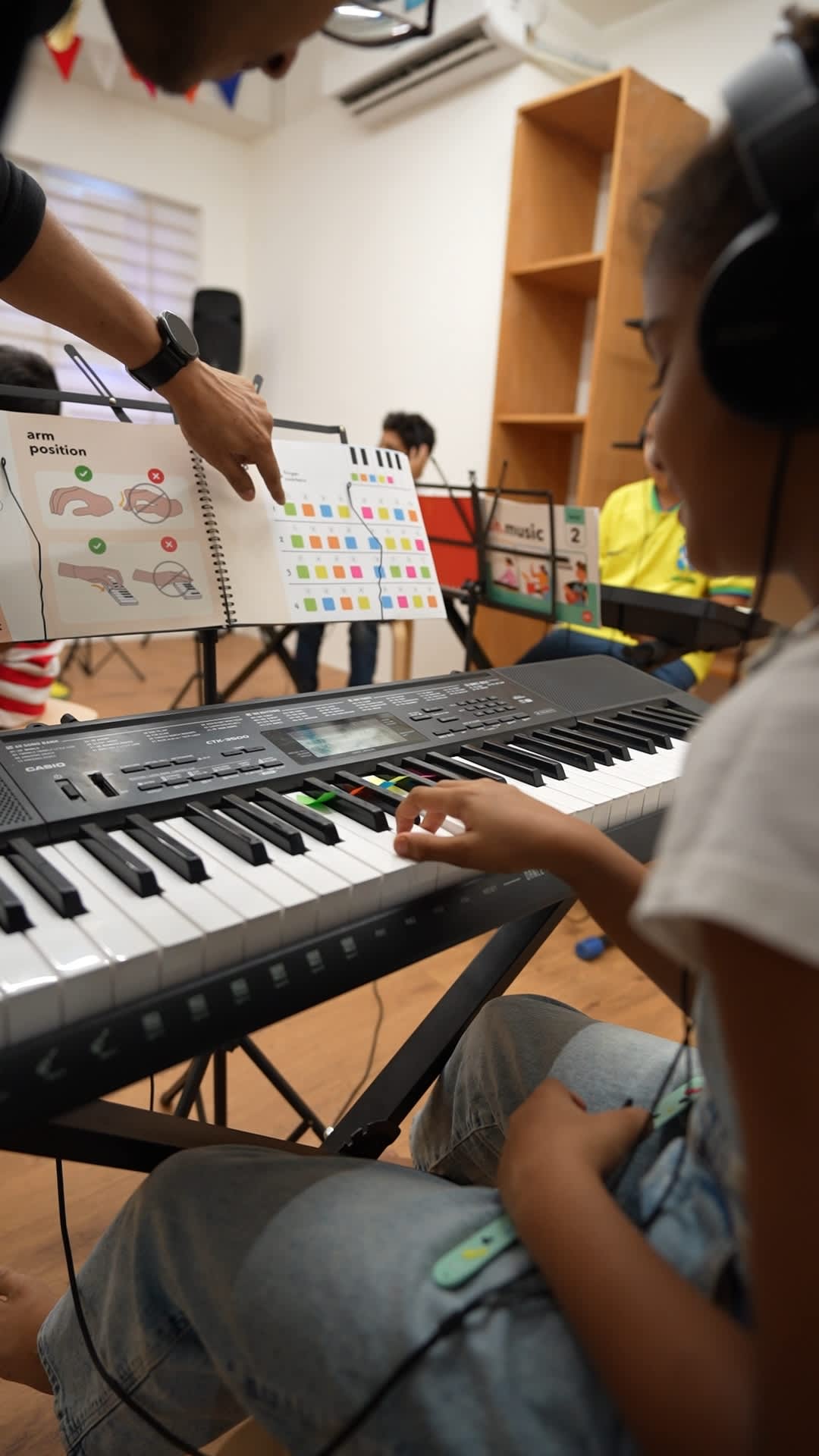 Hands-on learning on keyboard, drums and ukulele — using colour cues, simple patterns and guided steps.